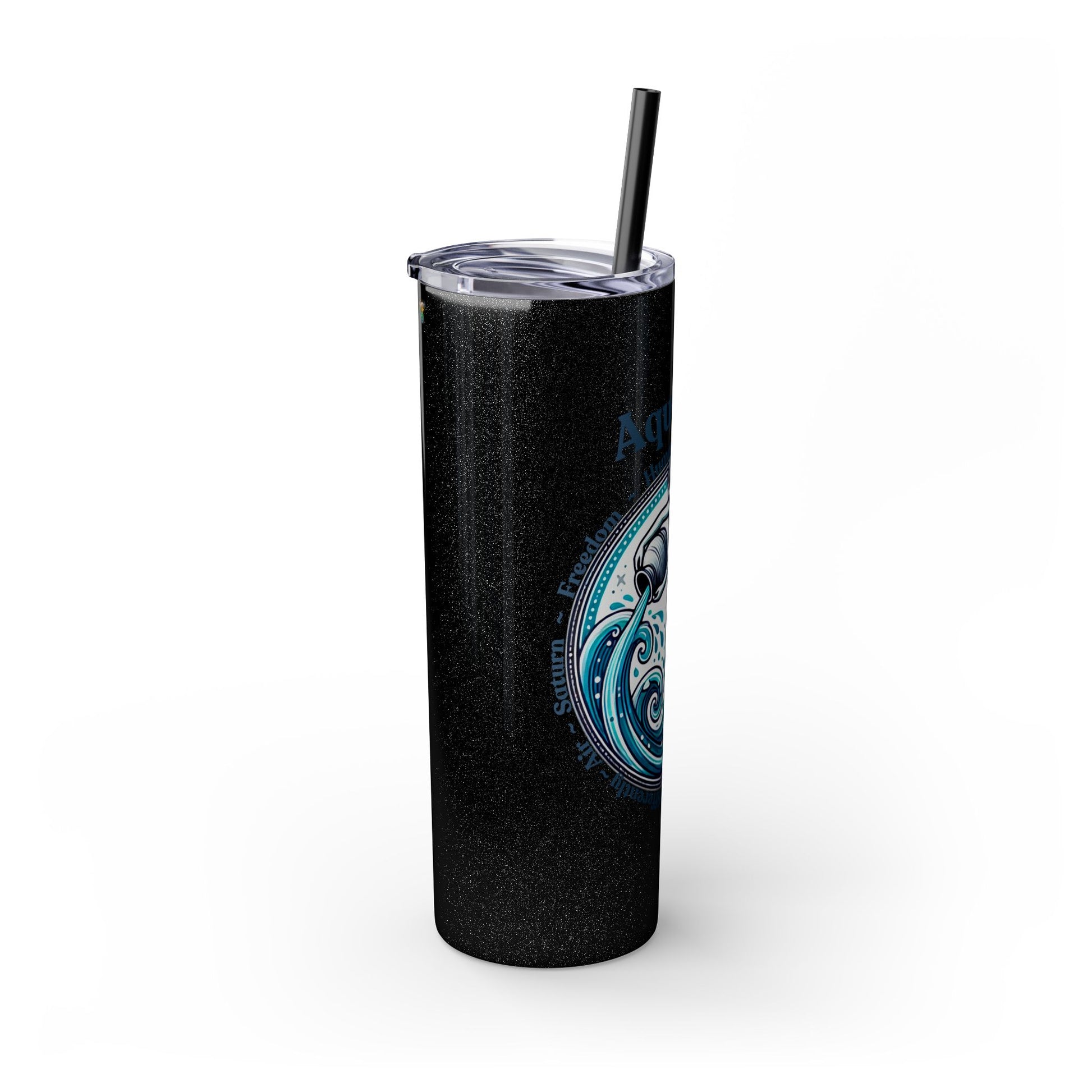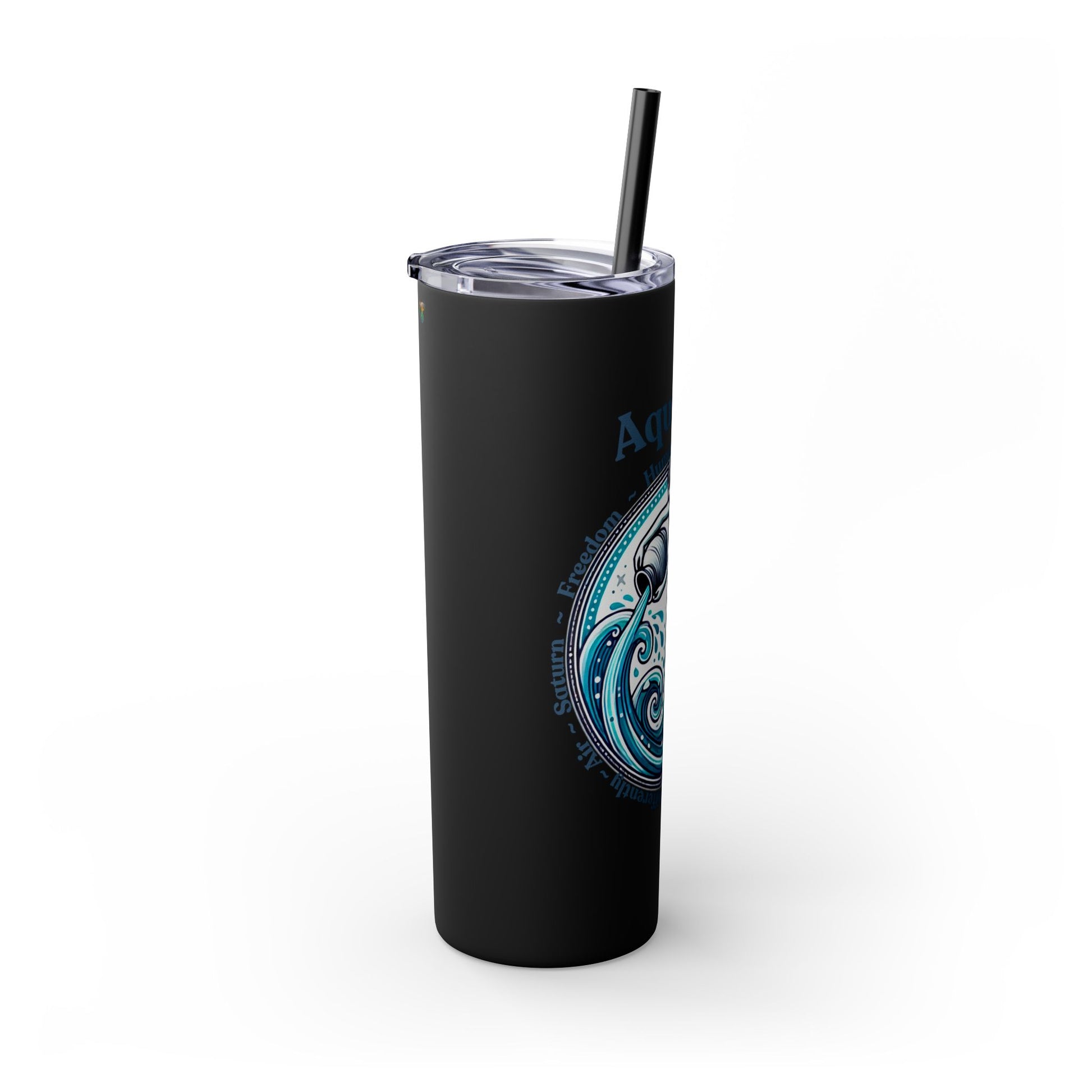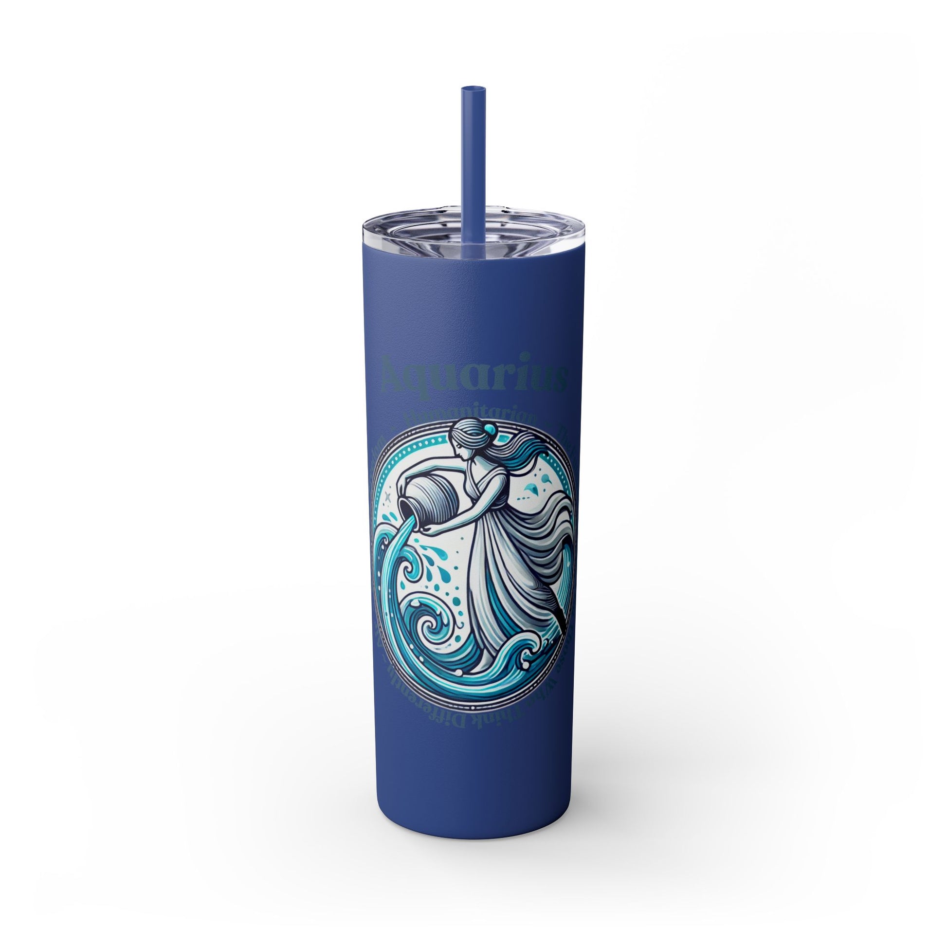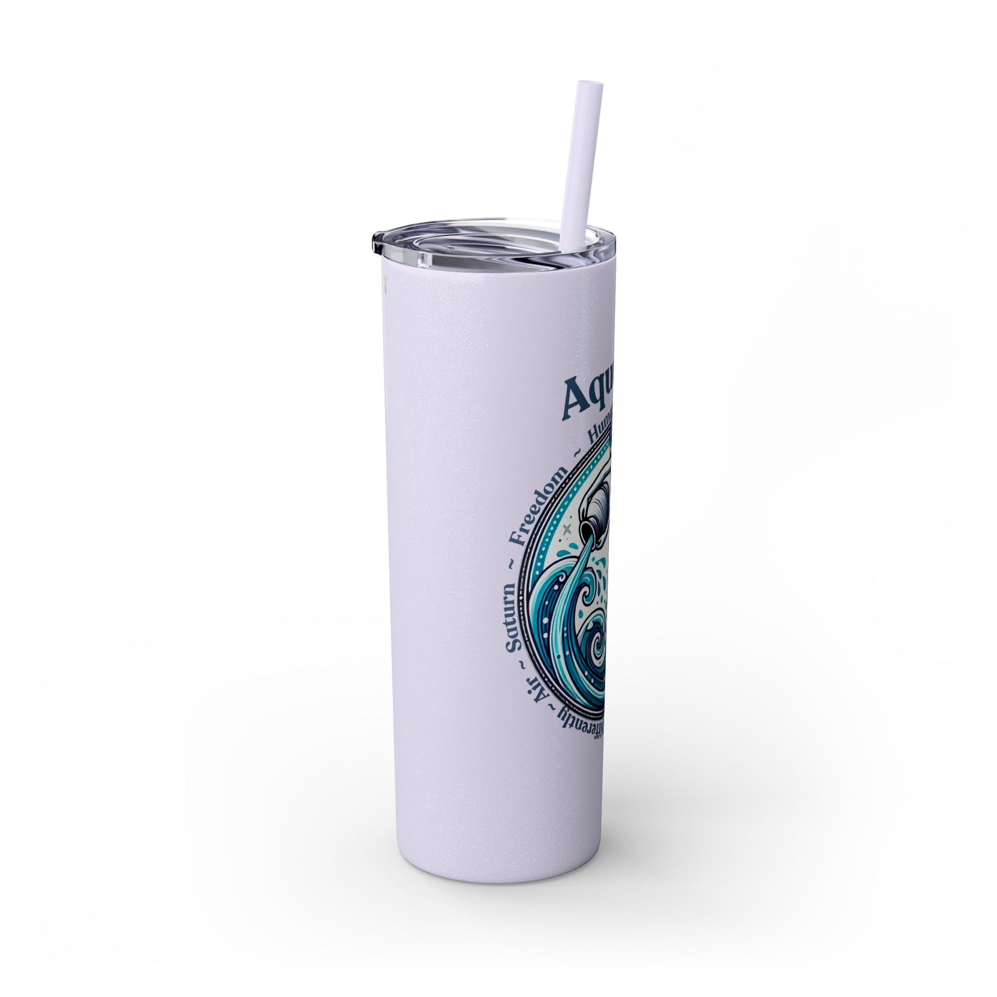 Aquarius Zodiac Tumbler with Straw - 20 oz - Astrology Drinkware for progressive humanitarians. This tumbler offers double-wall insulation to keep drinks hot for up to 12 hours and cold for up to 24 hours. Perfect for those who enjoy astrology and vibrant designs.